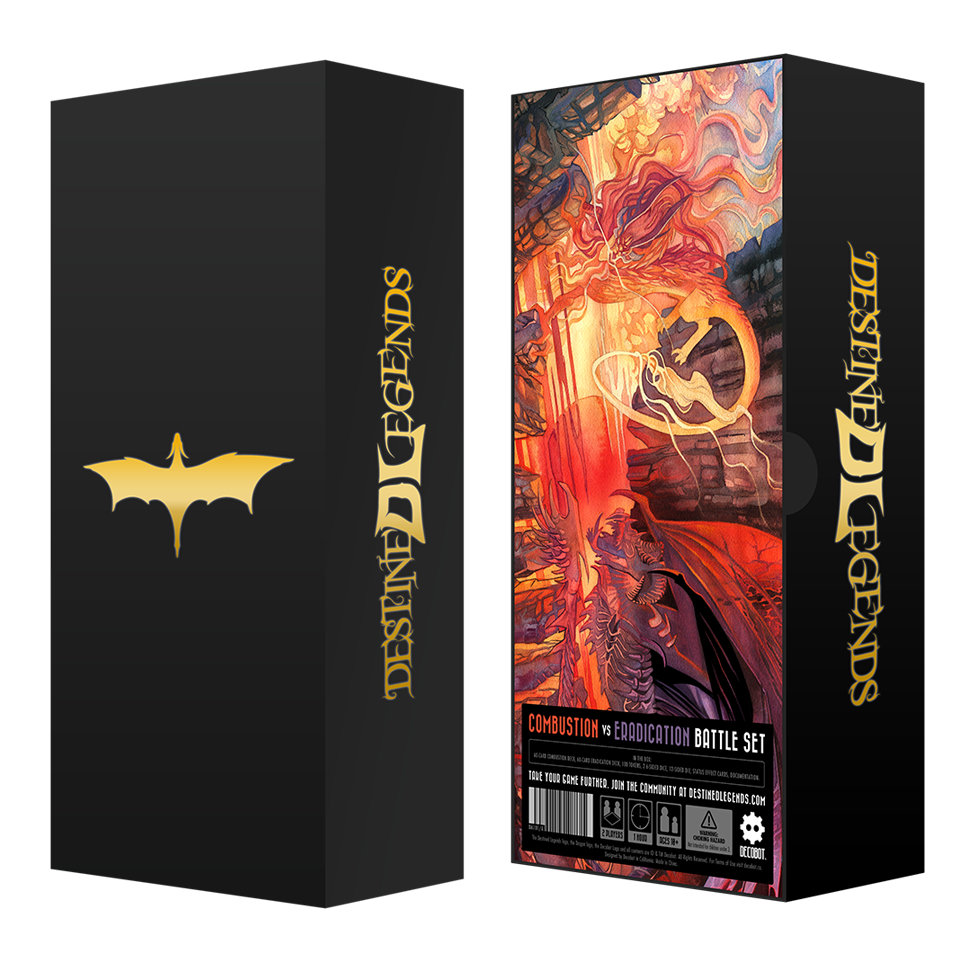 Jump into Destined Legends with the First Edition run of this 2-player set. This set features the fury of Fire with the "Combustion" deck, and the deception of Dark with the "Eradication" deck. The Battle Set also includes everything else you need, including Chessex™ premium dice, and HP tokens. Ships in July.